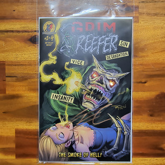 THATCHER CLEAVELAND: The comic Grim Reefer caught my eye as I was walking down the aisles. I met writer Thatcher Cleaveland who does both novels and comics. Grim Reefer is about a criminal who whose spirit is infused with the marijuana grown where his body was slain. So, anyone who smokes it, is possessed by him. Fun concept! Support Thatcher today!